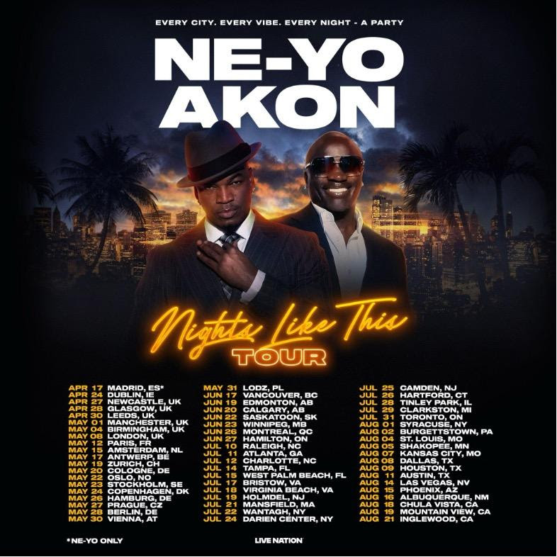 Grammy Award-winning hitmaker Ne-Yo and Grammy Award-winning multi-Platinum recording artist Akon announce their co-headlining "Nights Like This" global tour. Produced by Live Nation, the massive 57-city tour will make a stop at Darien Lake Amphitheater in Darien Center on Friday, July 24.