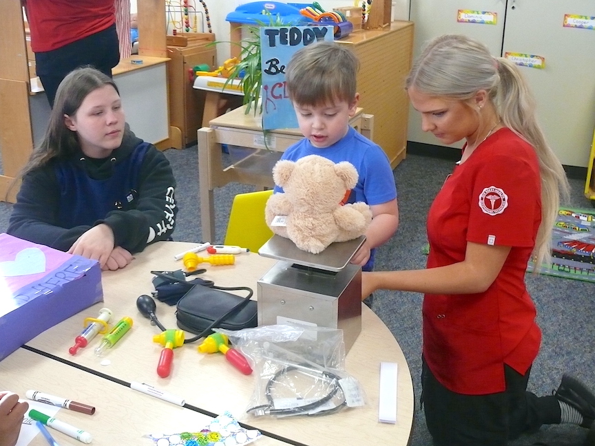 The health occupation technician seniors in Laura Vendryes class at Niagara Career and Technical Education Center (NCTEC) conducted a teddy bear clinic recently with the early childhood education class' preschool. The intention was to help the preschool students become more comfortable when they interact with medical professionals.