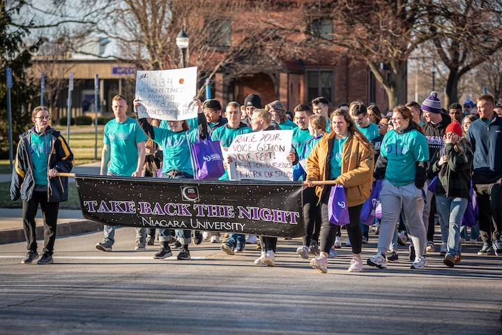 Hundreds of Niagara University students, faculty and staff were joined by members of the community on March 30 to "Take Back the Night." The annual event, now in its sixth year, aims to end gender-based violence in all forms, including domestic violence, dating violence, sexual assault, and stalking.