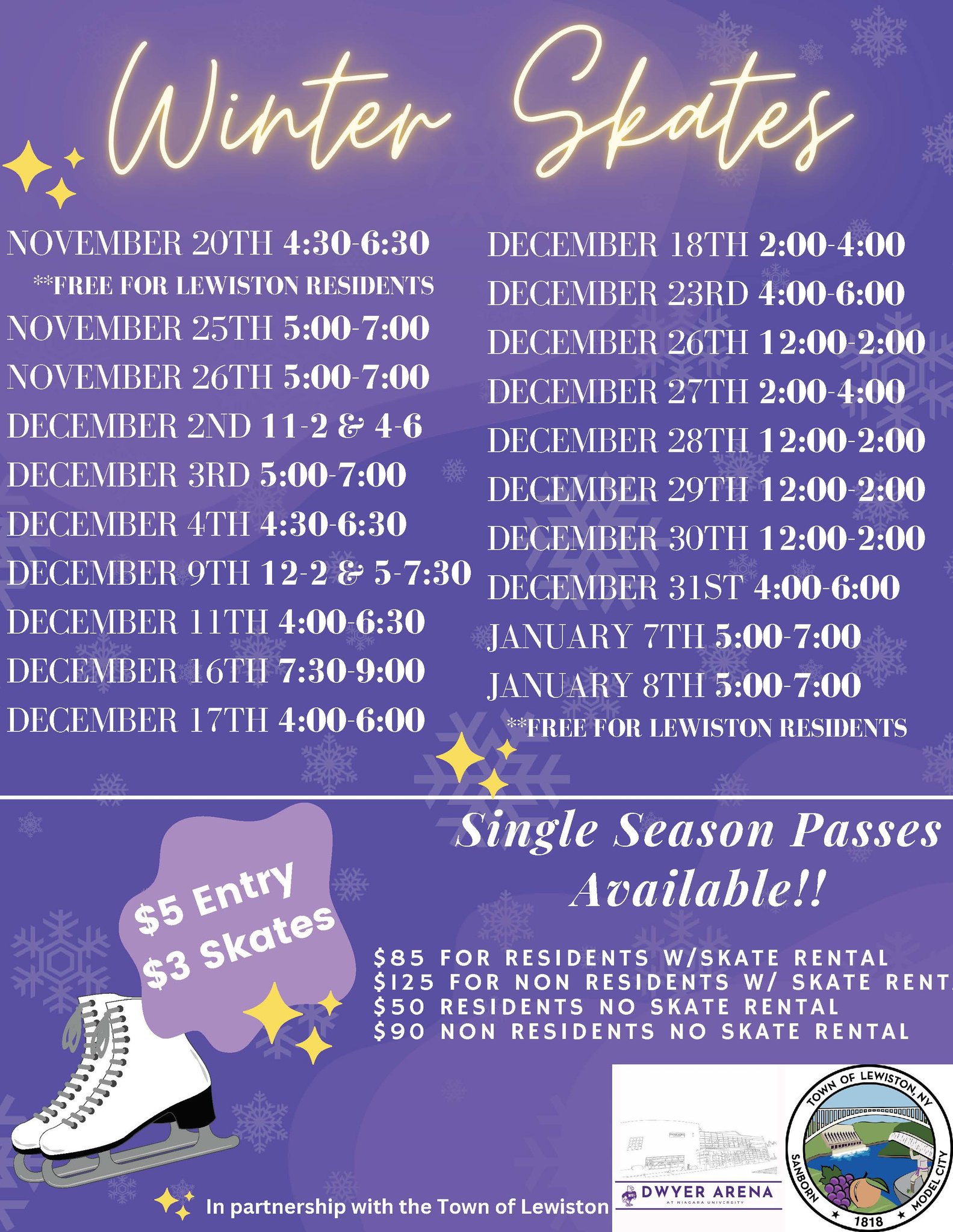 As the 2022 holiday season opens, the Town of Lewiston has some good news for the community and for the town's essential workers employees: At Monday's work session, board members announced an agreement with Niagara University for open skating at the Dwyer Ice Arena during the holiday season.