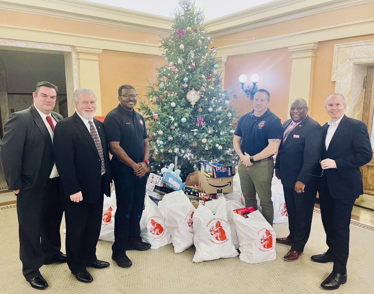 Niagara Falls firefighters delivered bags of toys to the Niagara County Courthouse rotunda right before the meeting of the County Legislature on Tuesday night. This was in support of the Christmas giving tree, where collections support Casey House Shelter, Twin Cities Outreach and the Salvation Army.