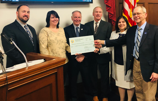 The Niagara County Legislature presented a check for $75,000 at its meeting Tuesday night to the Lockport Locks Heritage District in support of the Lock Tenders tribute monument. The Heritage District has raised $900,000 of the $1.4 million needed for the project, with Niagara County having previously contributed.
