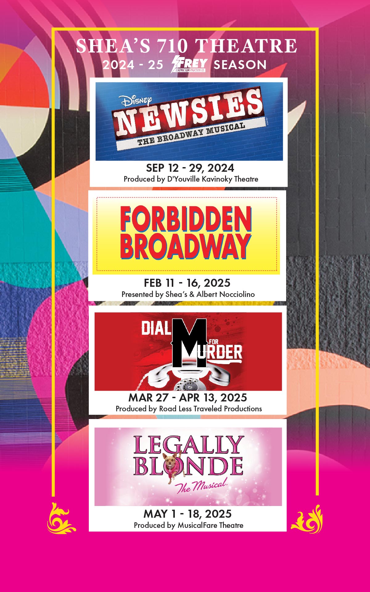 Shea's Performing Arts Center is proud to announce the 2024-25 Frey Electric Season at Shea's 710 Theatre. The season opens during the Theatre District Association's annual "Curtain Up" celebration and includes "Disney's Newsies" produced by the D'Youville Kavinoky Theatre; "Forbidden Broadway," presented by Shea's and Albert Nocciolino; "Dial M for Murder," directed by Road Less Traveled Productions; and "Legally Blonde" produced by MusicalFare Theatre.
