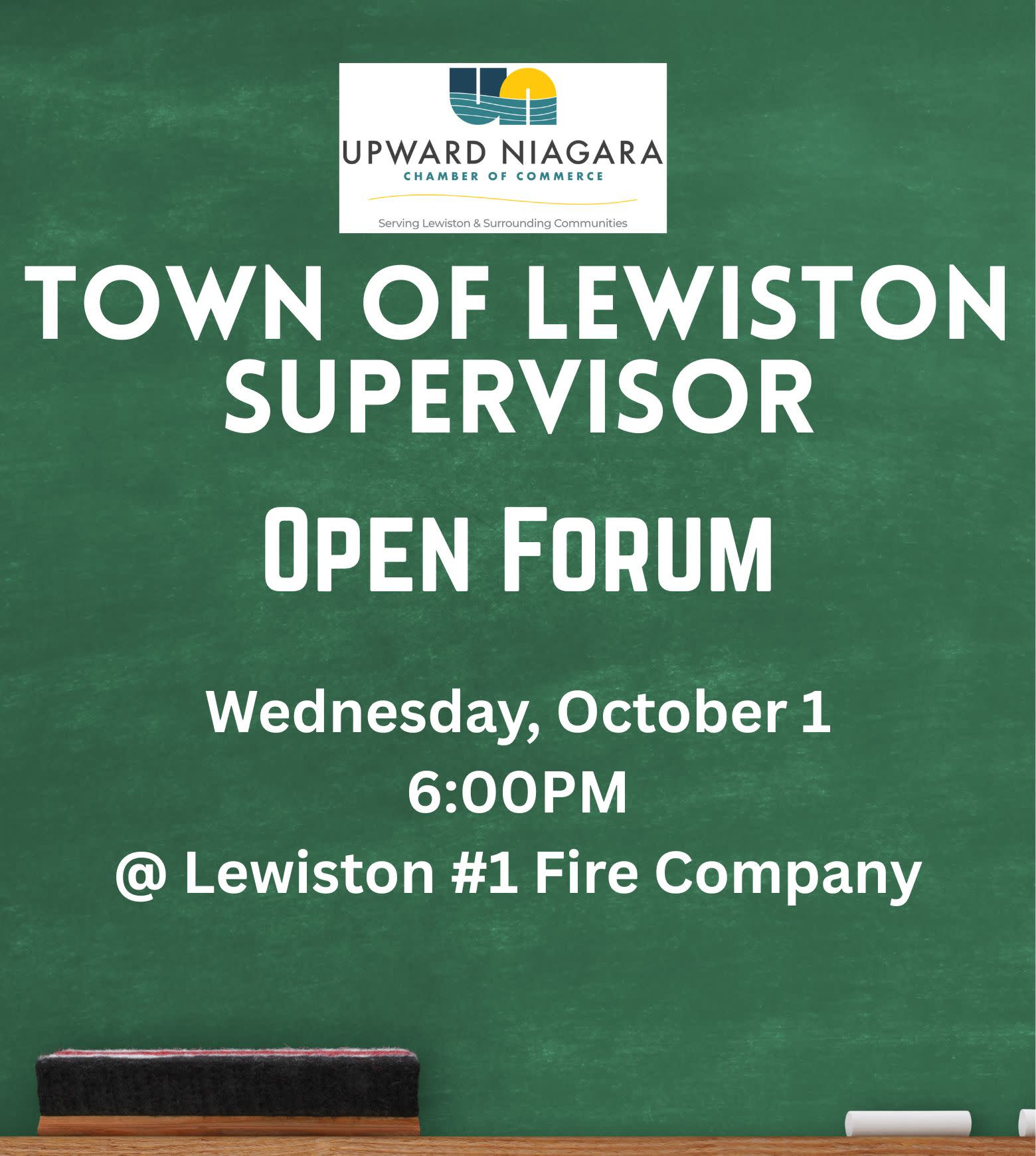 Recognizing the importance of learning more from the candidates running for Town of Lewiston supervisor - especially when it comes to plans for businesses in the community - the Upward Niagara Chamber of Commerce's government affairs committee will host its first Town of Lewiston supervisor open forum. The event will be held at 6 p.m. Wednesday, Oct. 1, at Lewiston No. 1 Fire Co., 145 N. Sixth St.