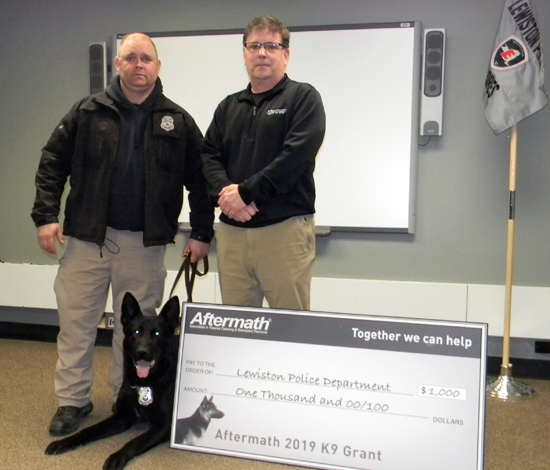 Ken Rosa, senior manager, law enforcement relations for Aftermath, visited the Lewiston Police Department this week for presentation of the Aftermath K-9 $1,000 grant.
