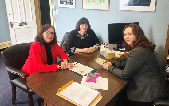 Niagara County Legislature Chairwoman Becky Wydysh, seated behind the desk, meets with YWCA of the Niagara Frontier Vice President of Programs Mary Brennan-Taylor and CEO Kathleen Granchelli to discuss several of the YWCA's life-saving services.