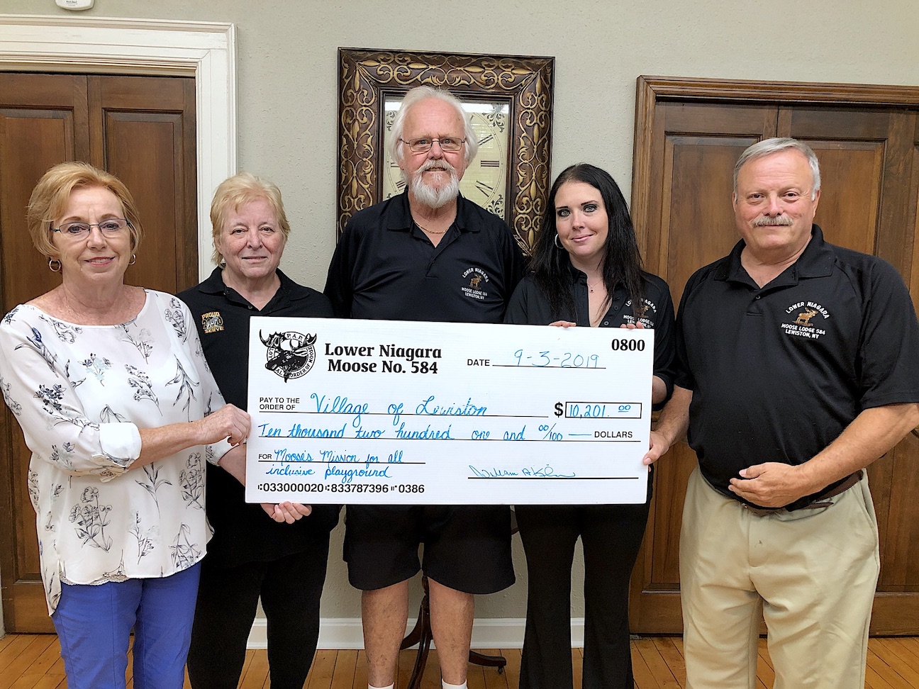 Village of Lewiston Deputy Mayor Vic Eydt joined with Ashley Olds, Bill Kilmer and Linda Fleck in presenting the municipality with $10,201 on Monday for the new inclusive playground project. The funds were generated at last month's "Moose's Mission" fundraiser, which was presented by Lower Niagara Moose Lodge No. 584 and Women of the Moose Chapter 1940.