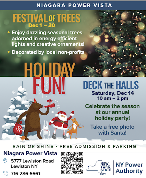 The New York Power Authority will hold its annual "Deck the Halls" holiday celebration on Saturday, Dec. 14, between 10 a.m. and 2 p.m., at the Niagara Power Vista - the visitors center for the Niagara Power Project. The event will feature free photos with Santa, musical entertainment, face painting, and arts and crafts.