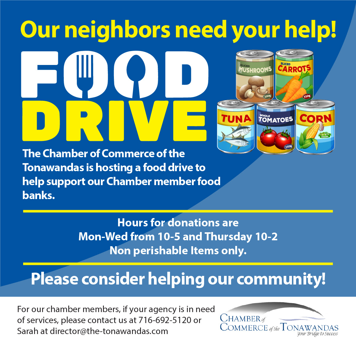 The Chamber of Commerce of the Tonawandas is hosting a food drive to help support member food banks. Hours for nonperishable donations are 10 a.m. to 5 p.m. Monday through Wednesday, and 10 a.m. until 2 p.m. Thursday, at 254 Sweeney St., North Tonawanda.