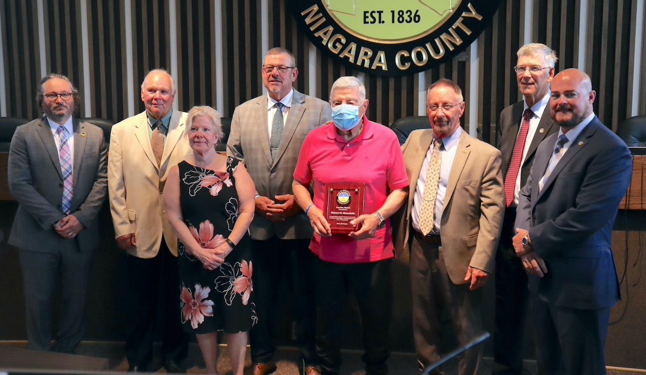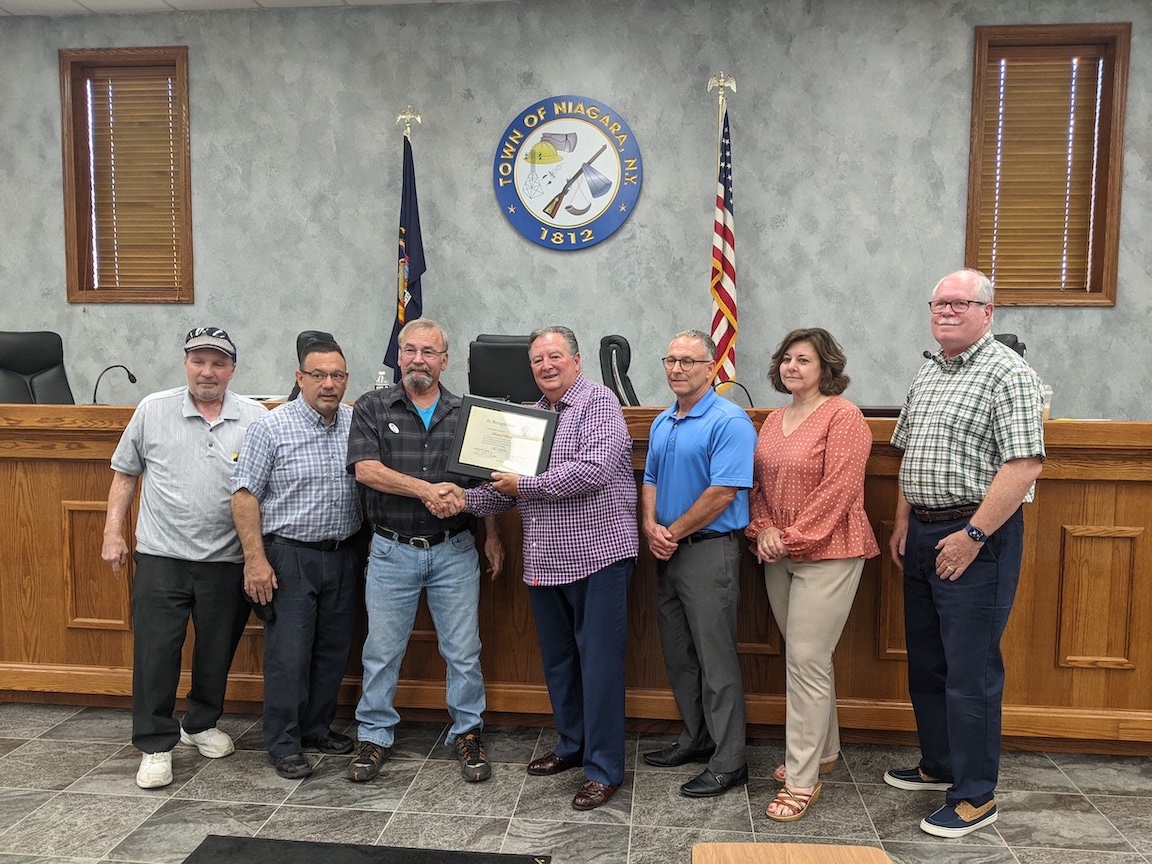 On Monday, the Wheatfield Town Board issued a formal proclamation to Richard Muscatello, a beloved and admired figure, for his many years of work and dedicated service. The board presented him with a plaque, a memorial bench (to be installed at the new Veterans Monument site behind Town Hall) and even a cake.