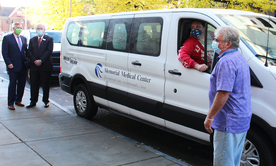 West Herr Auto Group President and CEO Scott Bieler presents Niagara Falls Memorial Medical Center with a brand-new van configured for patient transportation to make services at Memorial more accessible.
