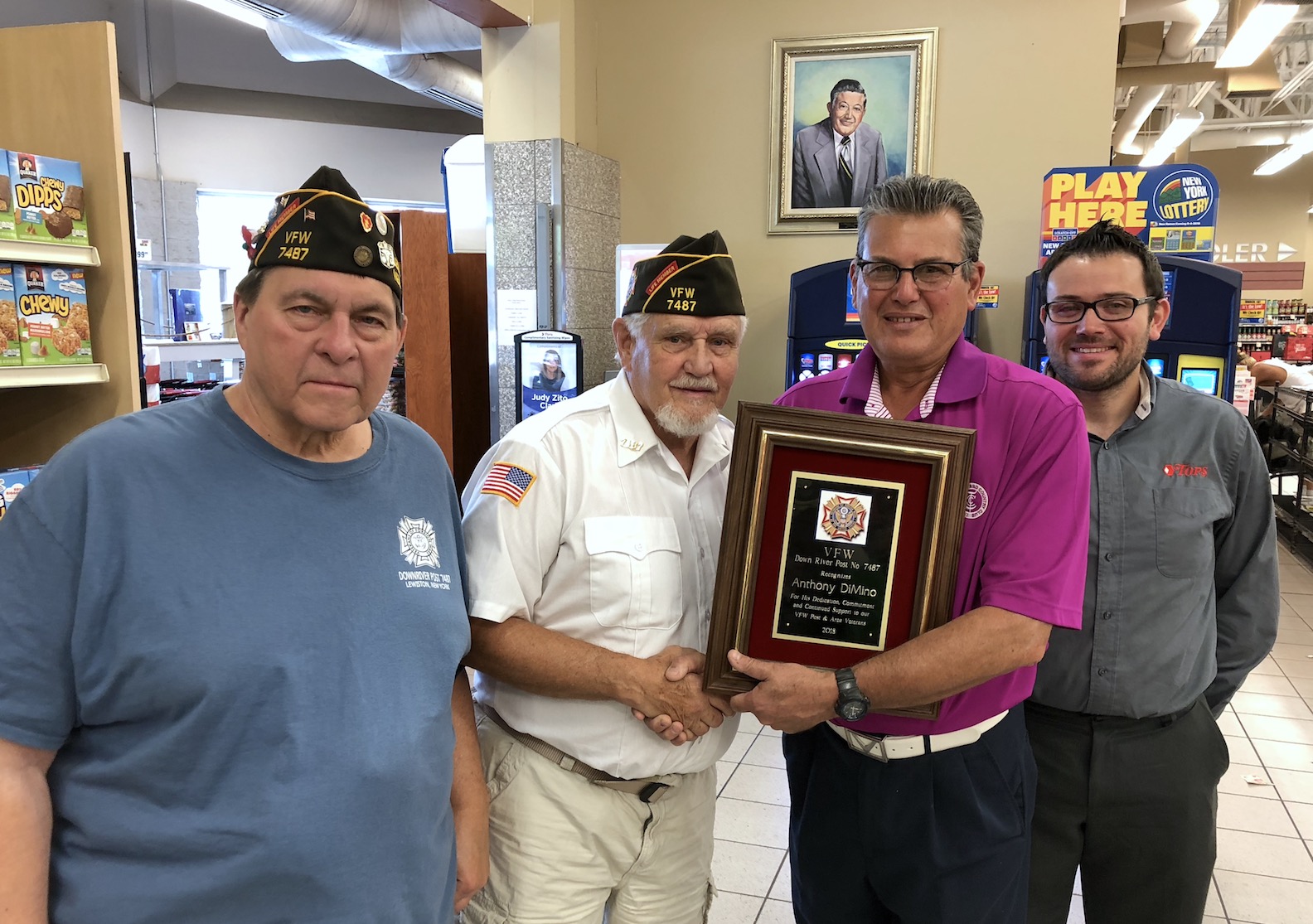 Veterans of Foreign Wars Downriver Post No. 7487 members Matt Zarosl and Vince Canosa (left two) on Thursday presented an award to DiMino Tops Lewiston owner Anthony DiMino and his son, John (right two).
