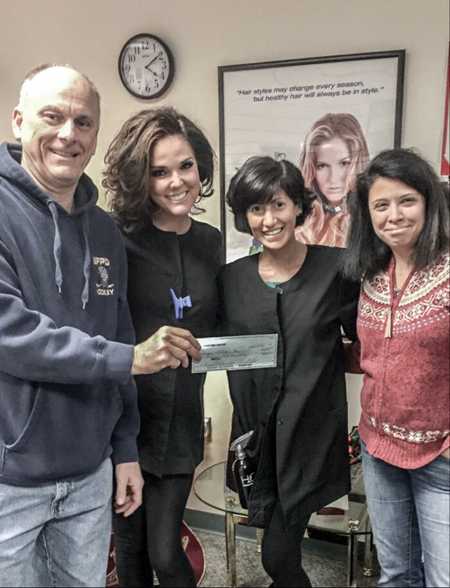 Cut-N-Shop Family Haircare owners David and Lindsey D'Avolio, along with stylist Nicole Syposs, hand over a check to Lisa LaTrovato of Women and Children's Hospital of Buffalo during their annual holiday "Cuts for a Cause" fundraiser.