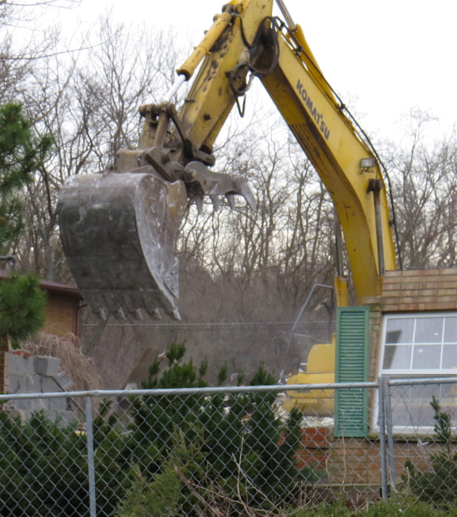 On Monday and Tuesday, demolition turned toward the Fairchild Place side. The far west wing was demolished first, followed by the front wall on the facing side of the former nursing home; then, the Fairchild sign and the glass panes above the main entrance.