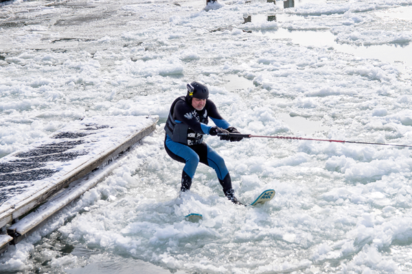 The Neptune Water Ski Club held their annual New Year's Day event in the Niagara River at Lewiston. They had to break ice out of the boat launch to get the ski boat in the water, and then had to ski around the ice flows in the river.