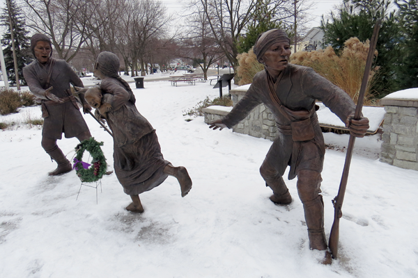A crowd gathered at 8 a.m. Monday morning in front of the Tuscarora Heroes Remembrance to observe the 203rd anniversary of the British attack on Lewiston. Participants recognized the efforts of brave Tuscarora warriors who helped men, women and children escape the War of 1812 attack that saw Lewiston burned.
