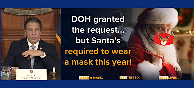 On Monday, Gov. Andrew Cuomo announced the New York State Department of Health has granted Santa Claus a waiver to travel to New York for Christmas. While DOH has granted the waiver, Santa will be required to wear a mask this year.
