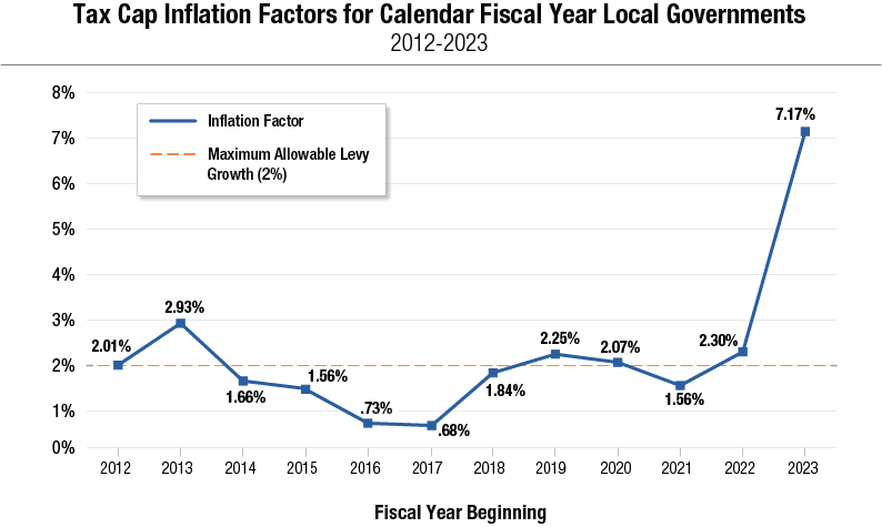 Property tax levy growth will again be capped at 2% for 2023 for local governments that operate on a calendar-based fiscal year, according to data released by New York State Comptroller Thomas P. DiNapoli. This figure affects tax cap calculations for all counties, towns and fire districts, as well as 44 cities and 13 villages.
