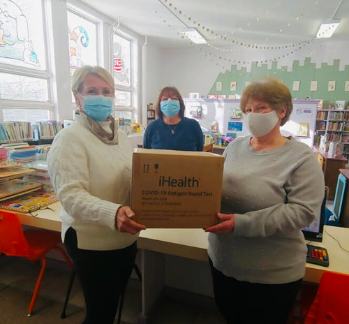Niagara County Legislator Irene Myers, left, delivers coronavirus test kits to Marlene Wessel and Karen Johnson of the Youngstown Free Library. The kits are available to any resident, free of charge, during the library's regular business hours.
