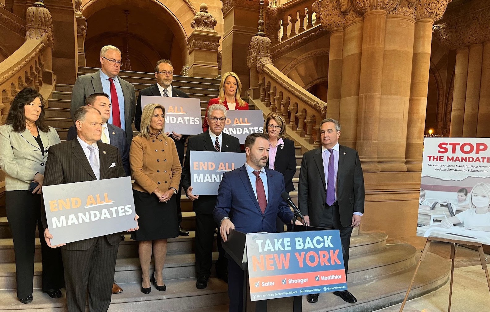On Monday, New York State Senate Republican Leader Rob Ortt and members of the Senate Republican Conference called for an end to what they called "unconstitutional mandates promulgated by Gov. Kathy Hochul and her Department of Health." The Republicans announced they would force a vote on the New York Senate floor to end the mandates.