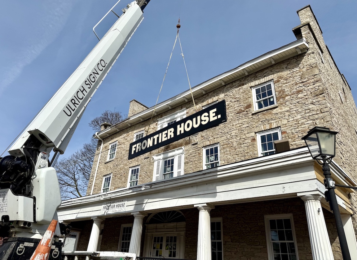 On Friday morning, Ulrich Sign removed the Frontier House sign Lewiston residents have known and stared at since 1964. The black-letter-on-white-background marker was taken down - it was gifted to the Historical Association of Lewiston and Lewiston Museum - and a new sign, reading "Frontier House." was installed. This billboard more closely resembles the original sign placed on the building in 1824 - with white letters on a black background - and, yes, the period, too.