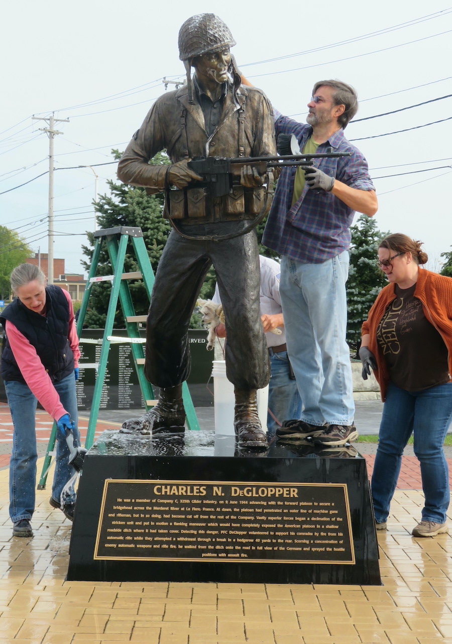 Sculptor Susan Geissler directed a group of volunteers from American Legion Post 1346 in the annual cleaning and waxing of the statue of Charles DeGlopper. Geissler, whose works include the Freedom Crossing and Tuscarora Heroes monuments in Lewiston, said regular cleaning and waxing of bronze sculptures will ensure they stay in good condition for years to come.