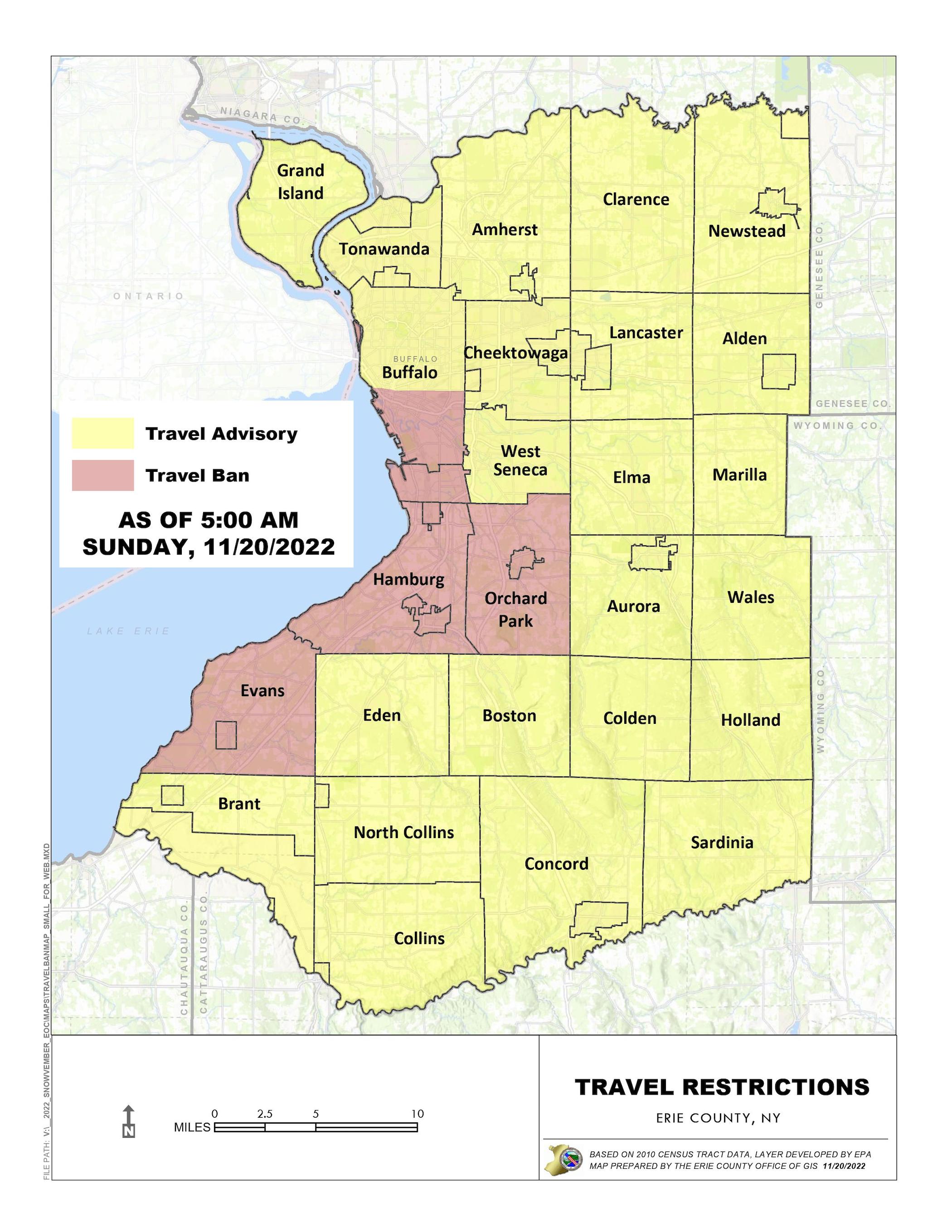 Following continued reviews of road conditions and weather forecasts and constant communication with city, town and village officials from throughout the region, Erie County announces it will update its travel restrictions to reflect the following as it pertains to driving bans starting Monday, Nov. 21.
