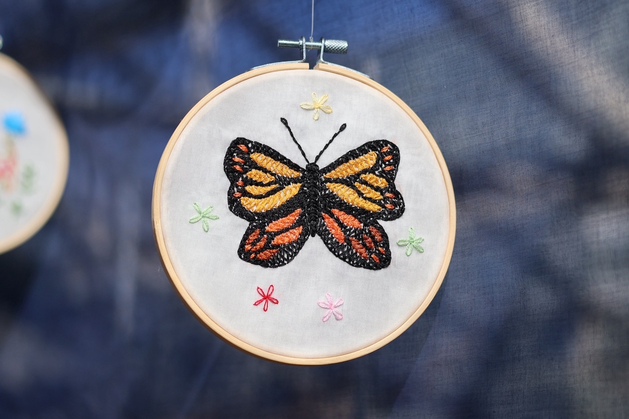 The Buffalo and Erie County Botanical Gardens and Stitch Buffalo have teamed up for "Pollinators and Flowers from Around the World," a handcrafted textile art exhibit made of embroidery hoops with floral and pollinator motifs.