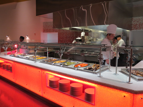 With the new design, overall seating at Thunder Falls Buffet will increase from 420 to 500 seats. A unique wine and beer display, large video screens and colored lighting will add to the interactive and exciting feel inside the restaurant. In addition, terrazzo floors, rich fabrics, intricately lit buffet stations and a sound system with music are just some of the new features that await guests.